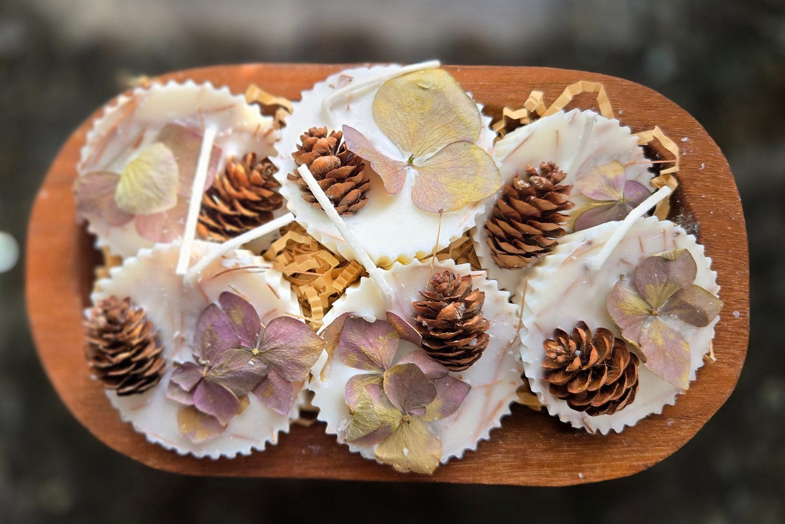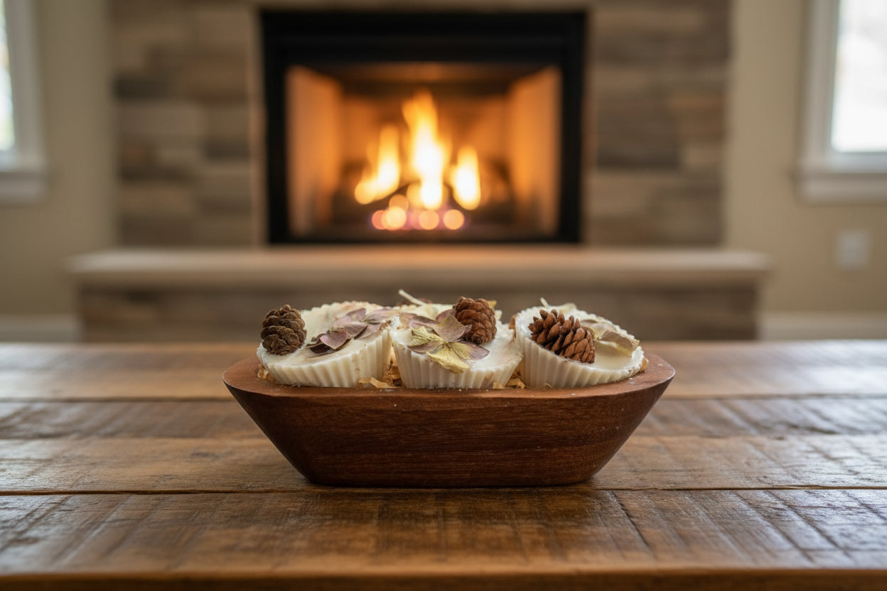 A set of 6 firestarters, packaged in a wood dough bowl, perfect for gifting! These are perfect for fireplaces, fire pits and campfires! They're made using a blend of unscented soy, coconut and palm waxes, and are infused with natural elements we forage on our property...dried pine needles, dried flowers, evergreen stems (designs can vary based on season), and each one is topped off with a cute little pinecone from our magical tiny-cone producing pine tree! The dough bowl & firestarters are wrapped with decorative cellophane for a ready-made gift!